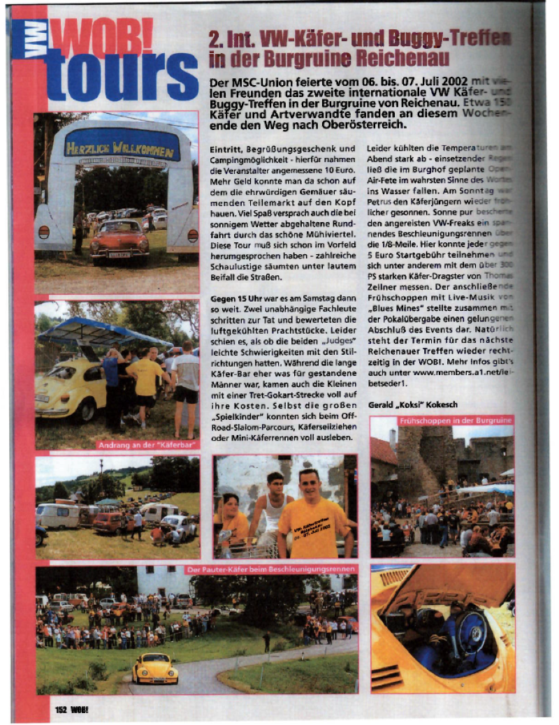 ... in Bearbeitung Koksi hat einige Fotos aus dem Jahr 2002 (noch richtige Fotos) gefunden - hier einige Erinnerungen. Die Zeitschrift WOB von Helmut hatte damals über diverse Treffen informiert - z. B: das Käfertreffen in der Burgruine Reichenau (nähe Linz - OÖ)