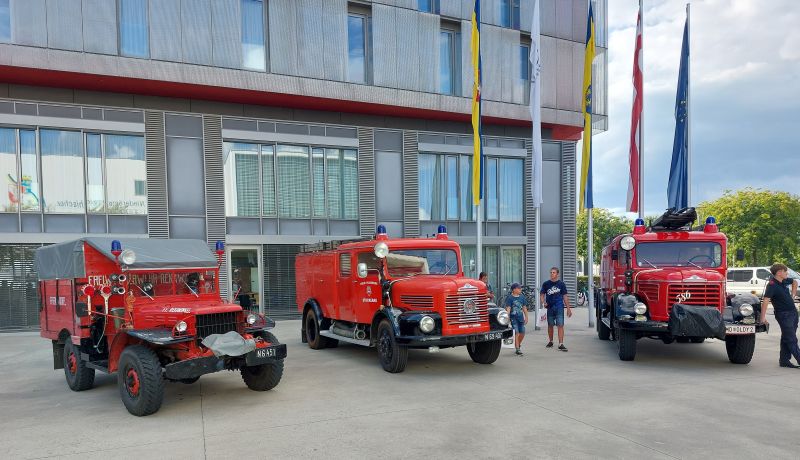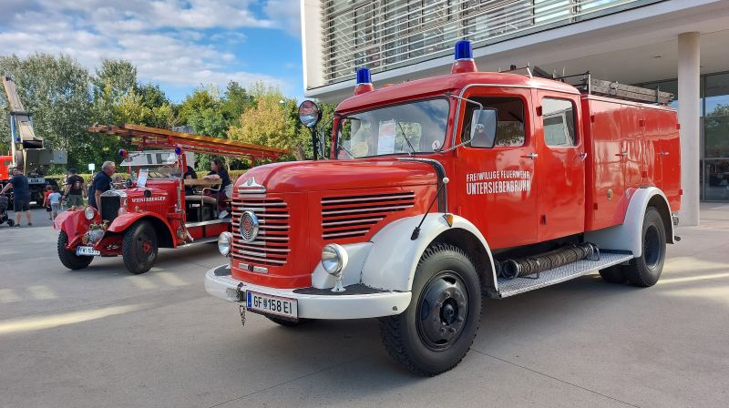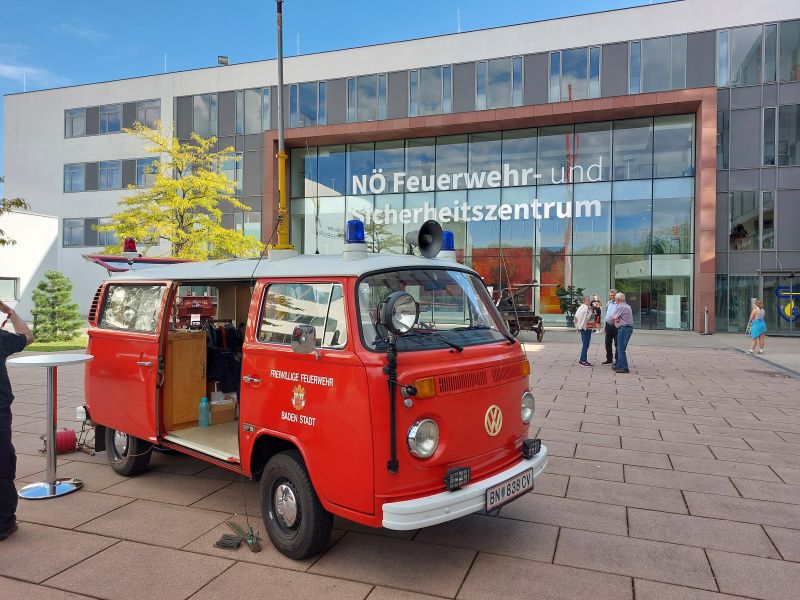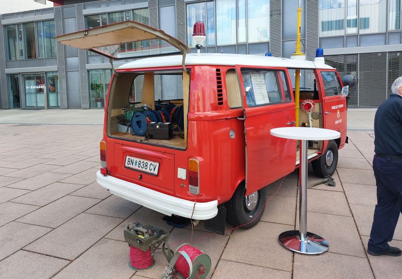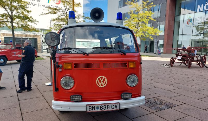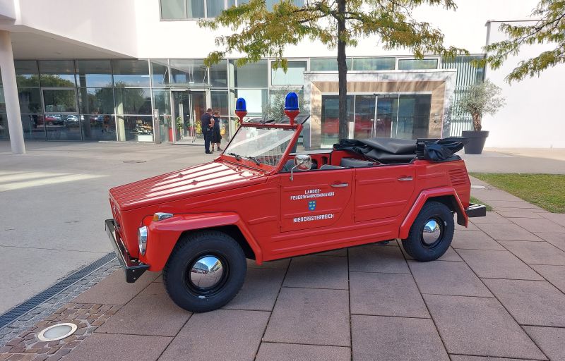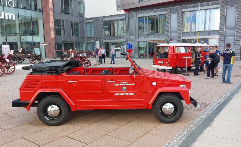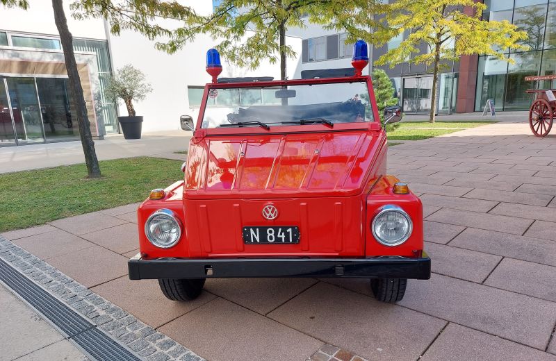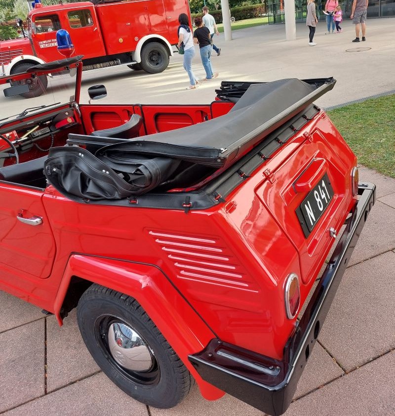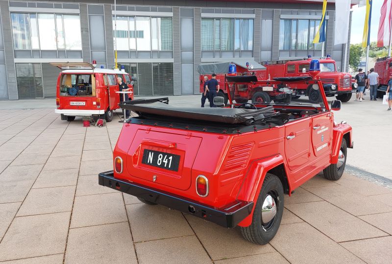 Anmerkung: Verdeck nicht fachgerecht zusammengefaltet - ist anscheinend beim Aufbaustress passiert (VW 181 stammt aus dem hauseigenen FF-Museum)