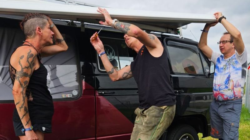 Am nächsten Tag dann die Bus-Markise am T3 reparieren - da war was mit viel Regen und etwas Wind ....